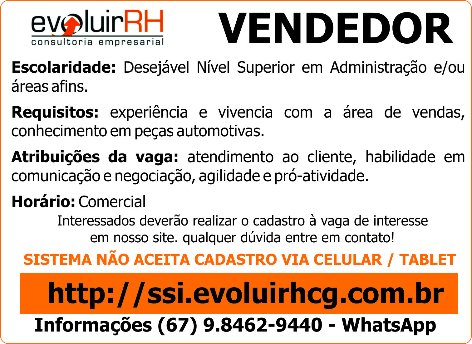 Atribuições da vaga: atendimento ao cliente, habilidade em comunicação e negociação, agilidade e pró-atividade.