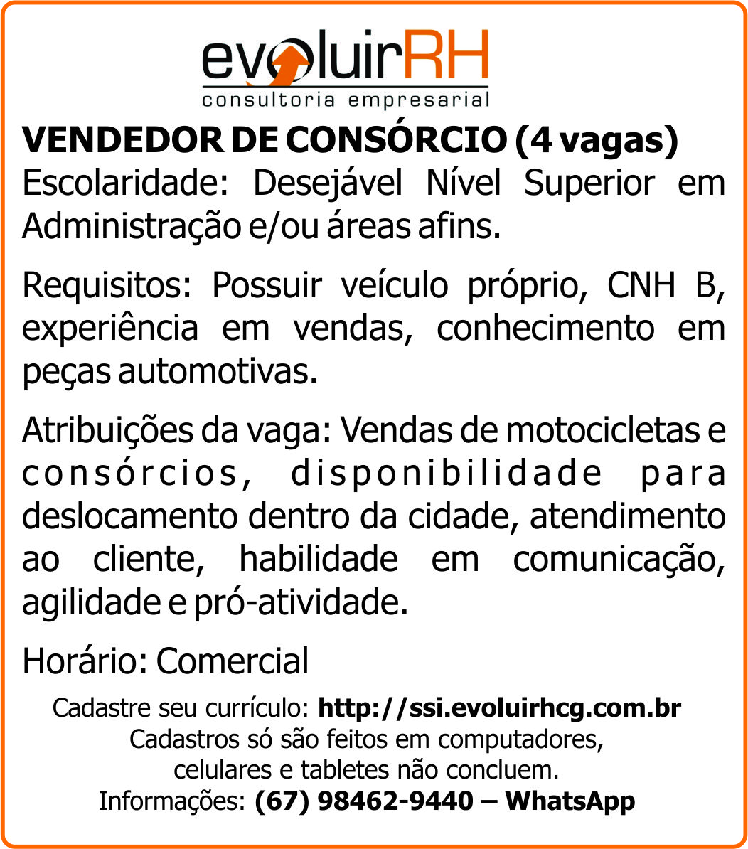Atribuições da vaga: Vendas de motocicletas e consórcios, disponibilidade para deslocamento dentro da cidade, atendimento ao cliente, habilidade em comunicação, agilidade e pró-atividade.