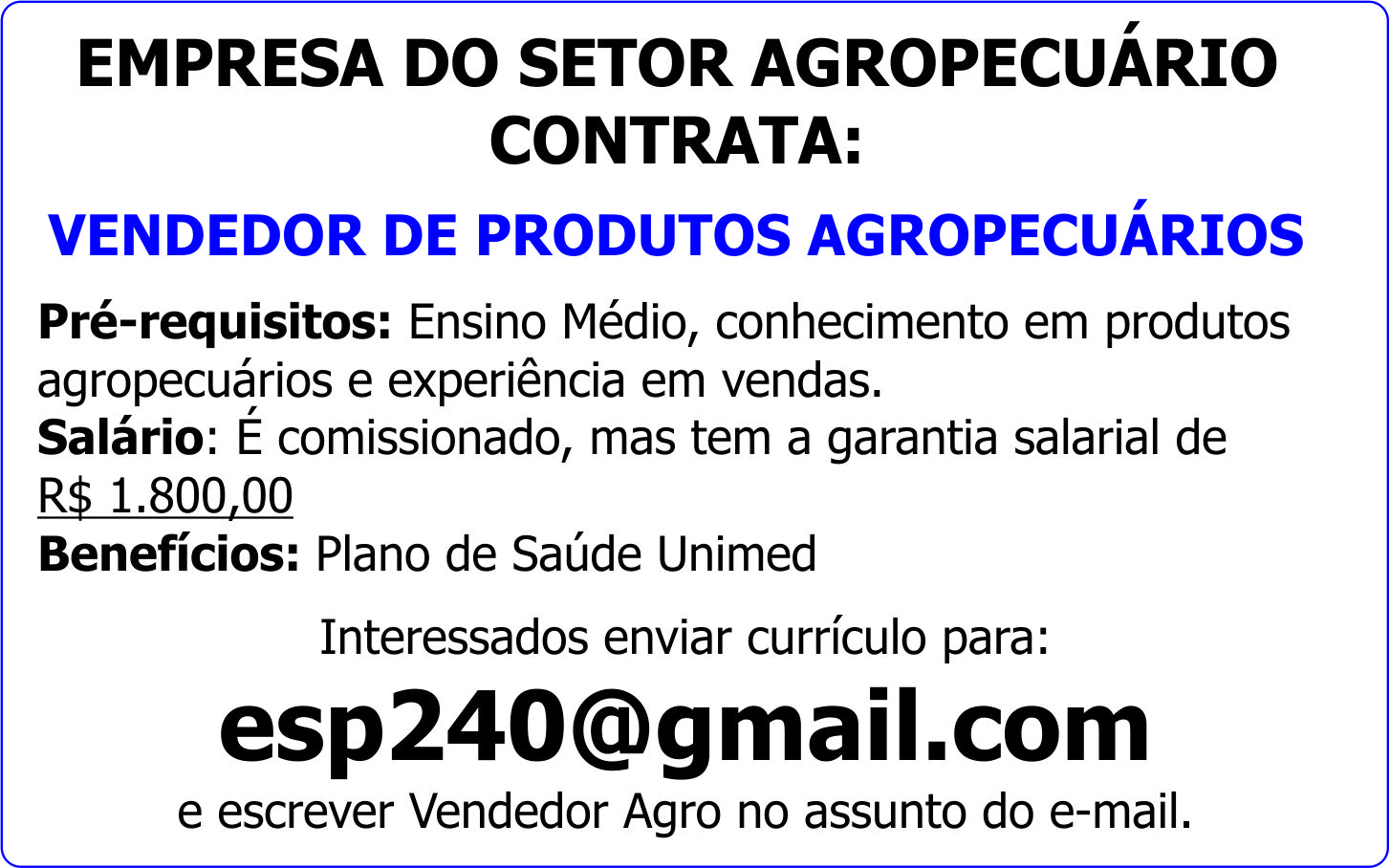 Interessados enviar currículo para: [email protected] e escrever Vendedor Agro no assunto do e-mail.