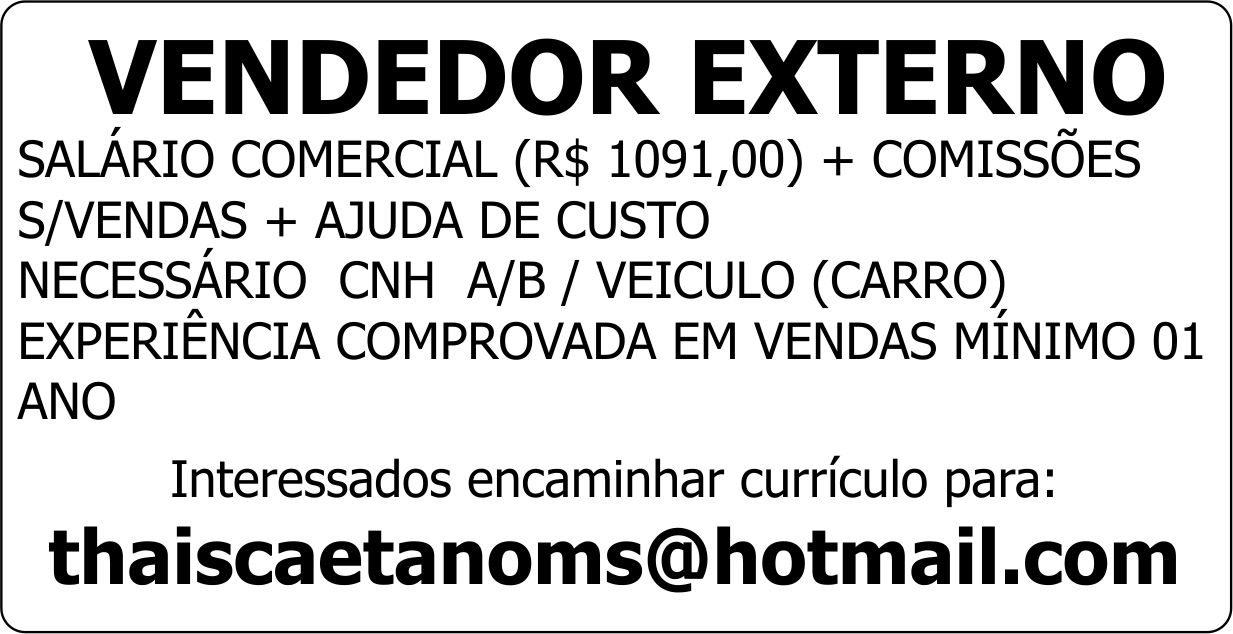 NECESSÁRIO CNH A/B / VEICULO (CARRO) EXPERIÊNCIA COMPROVADA EM VENDAS MÍNIMO 01 ANO