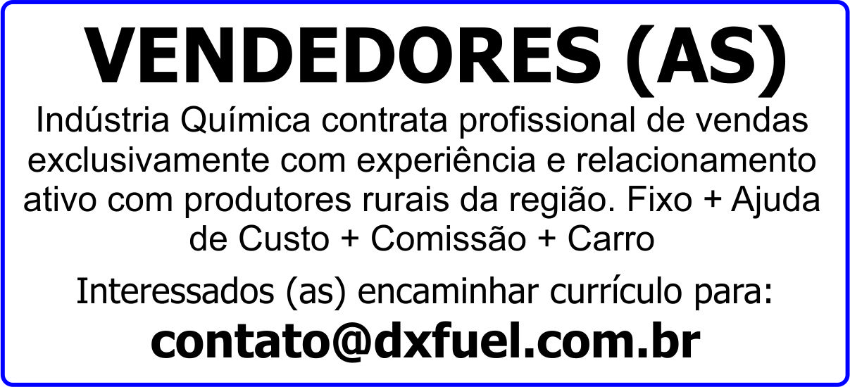 Indústria Química contrata profissional de vendas exclusivamente com experiência e relacionamento ativo com produtores rurais da região. Fixo + Ajuda de Custo + Comissão + Carro