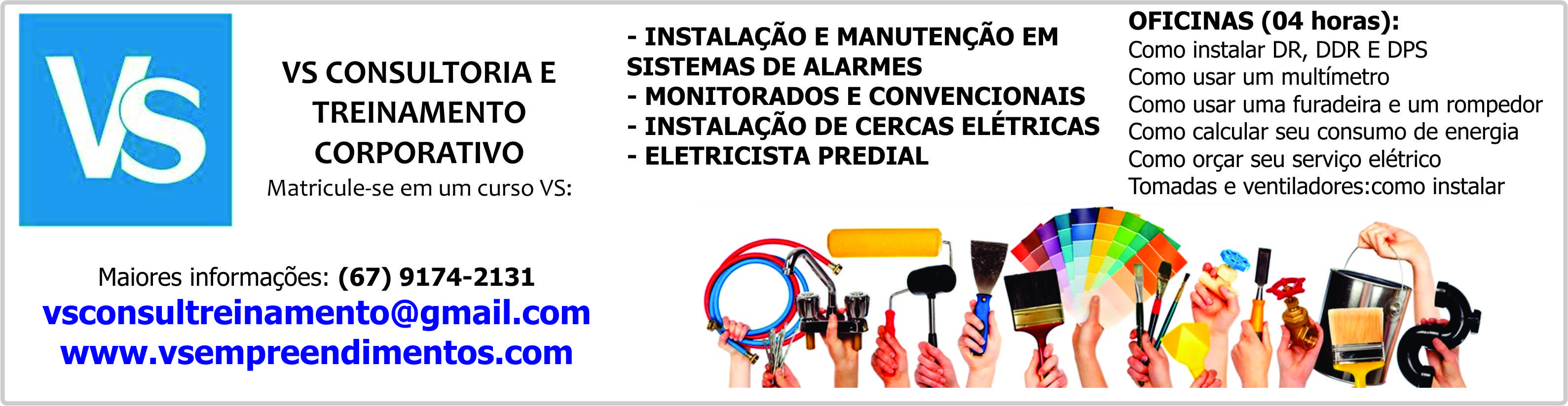 VS - Cursos: - INSTALAÇÃO E MANUTENÇÃO EM SISTEMAS DE ALARMES - MONITORADOS E CONVENCIONAIS - INSTALAÇÃO DE CERCAS ELÉTRICAS - ELETRICISTA PREDIAL: