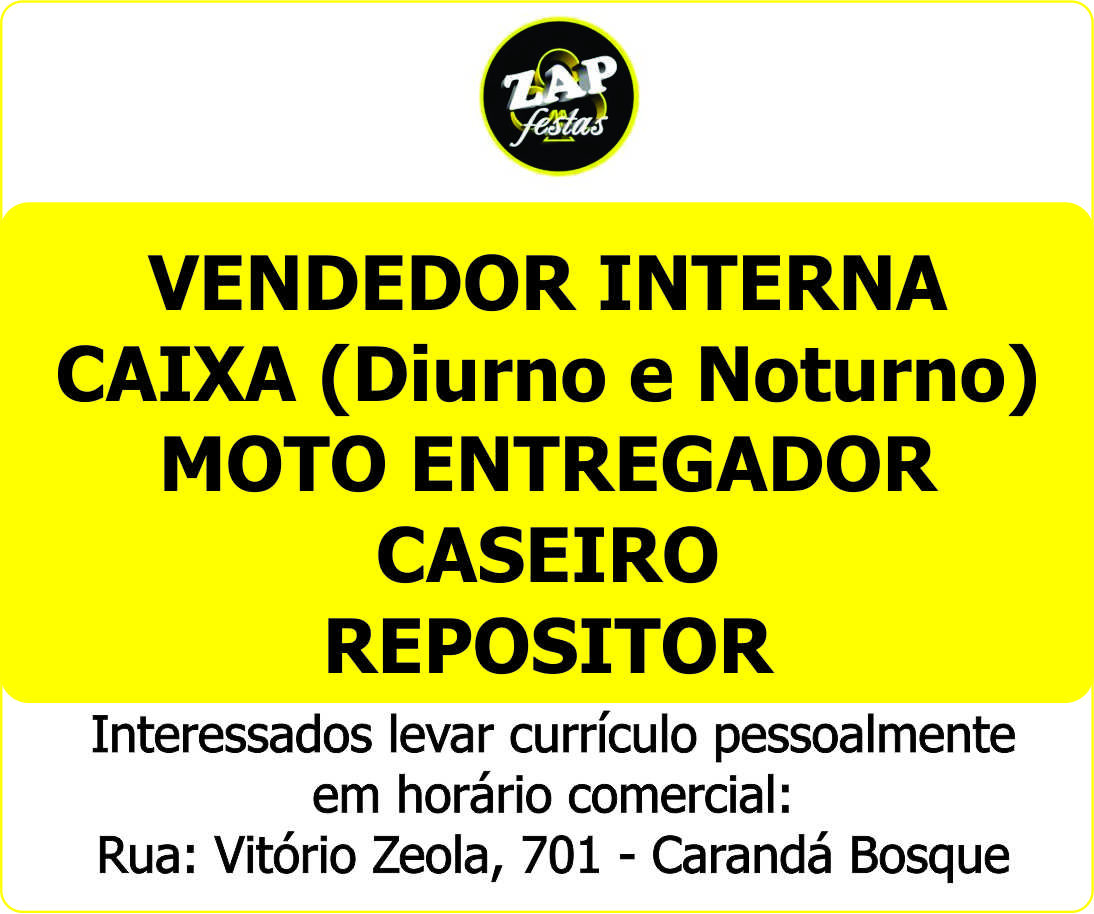 Zap Festas - Vendedora Interna / Caixa / Caseiro / Repositor