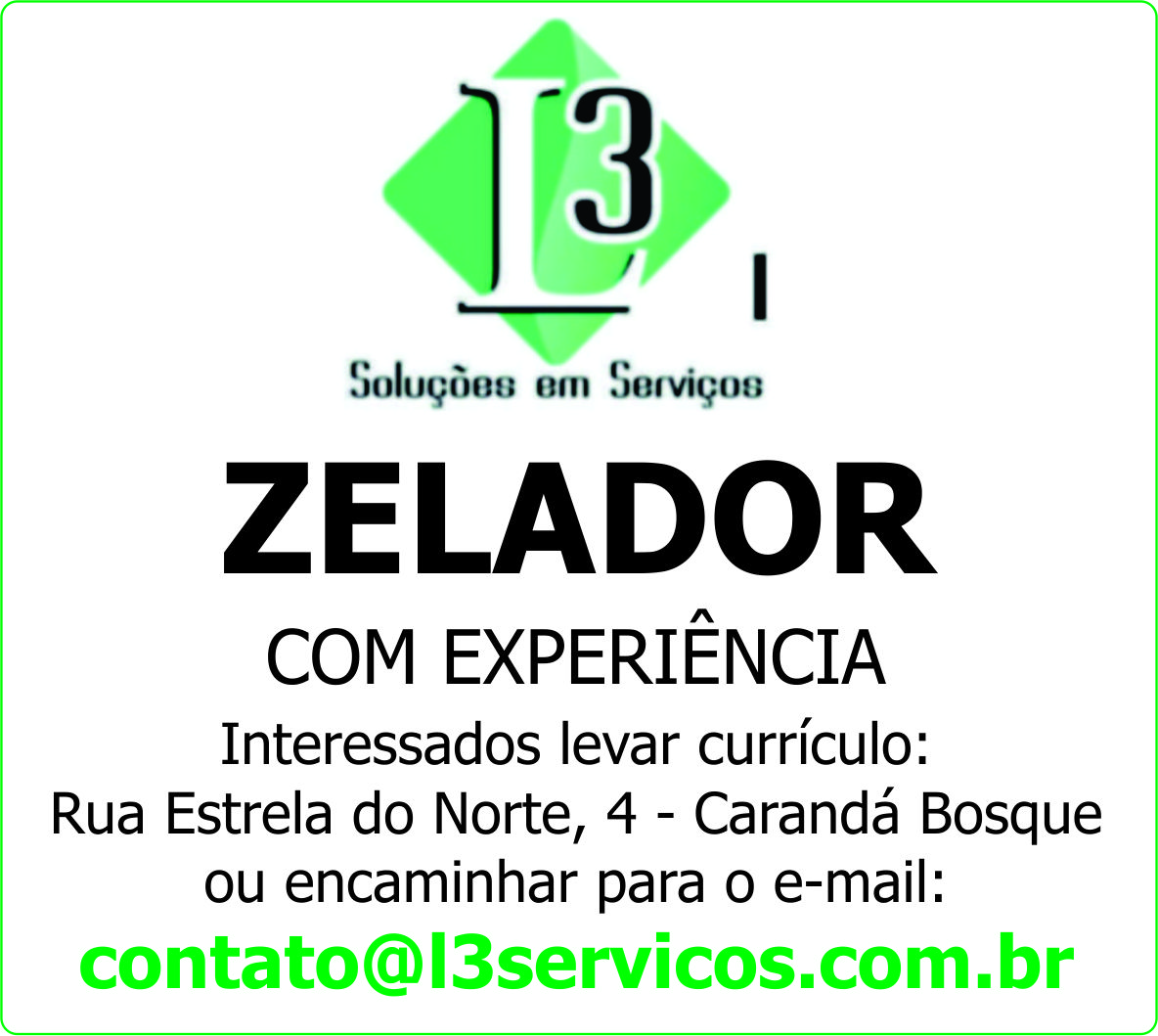 Interessados levar currículo: Rua Estrela do Norte, 4 - Carandá Bosque