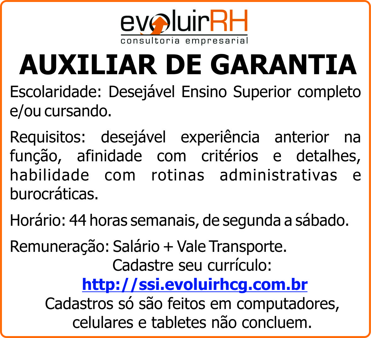 Cadastre seu currículo: http://ssi.evoluirhcg.com.br