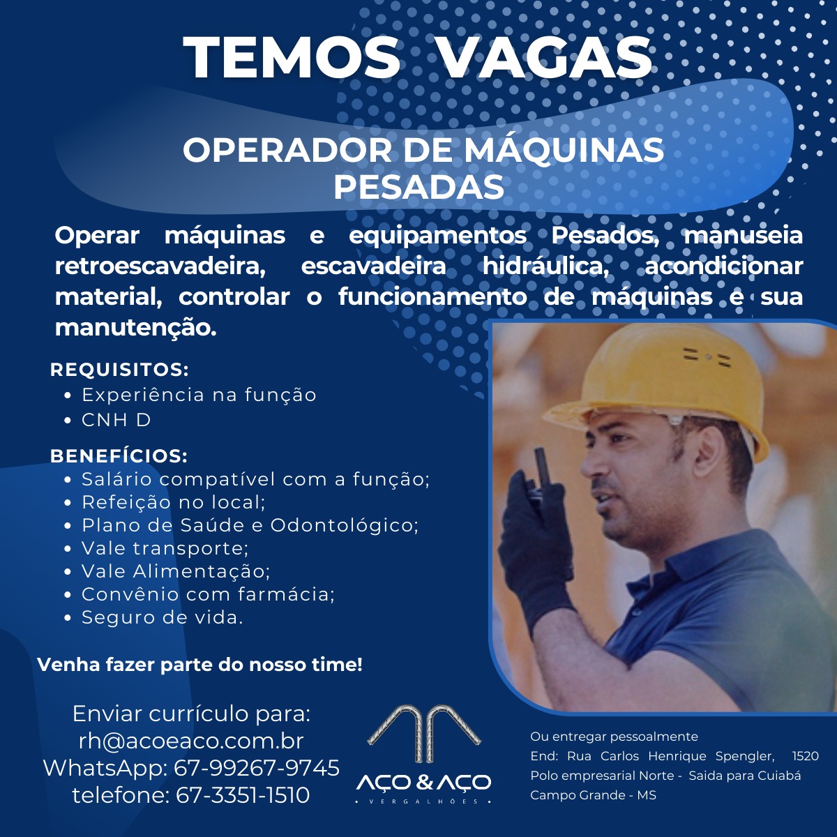 Interessados enviar currículo para: [email protected] ou entregar pessoal da empresa AÇO E AÇO: Rua Carlos Henrique Spengler, 1520 - Polo Empresarial Norte. WhatsApp: (67) 99267-9745 ou 3351-1510