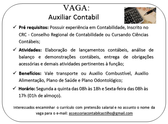 - Pré requisitos: Possuir experiência em Contabilidade, Inscrito no CRC - Conselho Regional de Contabilidade ou Cursando Ciências Contábeis;