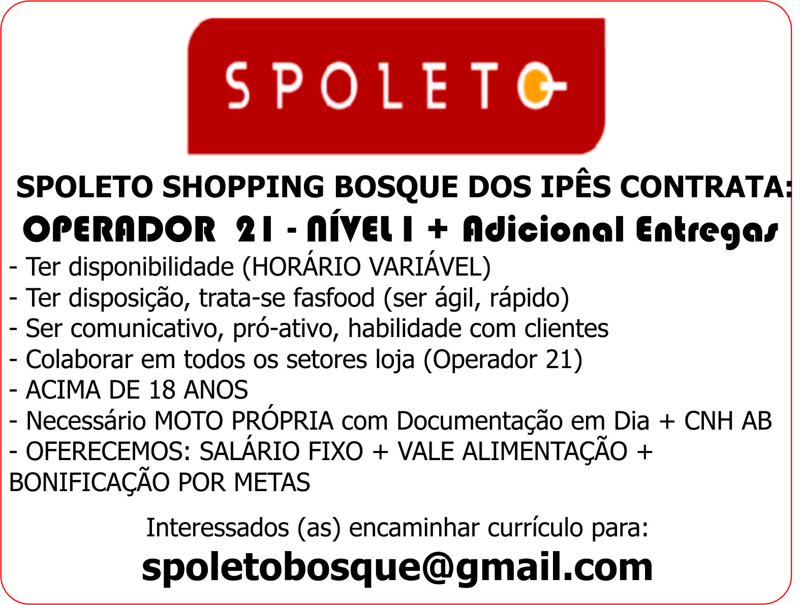 - OFERECEMOS: SALÁRIO FIXO + VALE ALIMENTAÇÃO + BONIFICAÇÃO POR METAS
