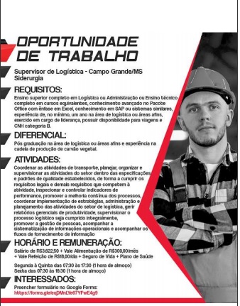 Supervisor de Logística, posição a ser ocupada em Campo Grande/MS.