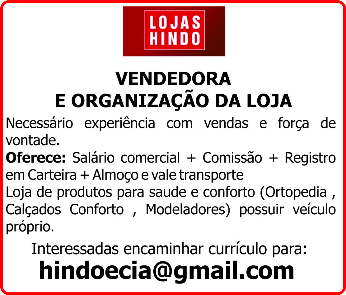 Oferece: Salário comercial + Comissão + Registro em Carteira + Almoço e vale transporte